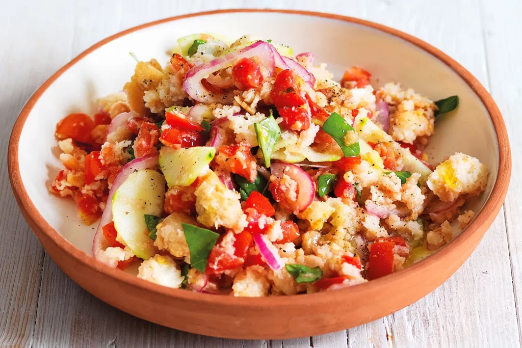 Panzanella is a tasty summer dish of ancient tradition, born from the need not to throw anything away. It is prepared with fresh vegetables (ripe tomatoes, cucumbers, onions and basil) and stale Tuscan bread, which is soaked in water and then squeezed before being mixed with the other ingredients cut into small pieces and seasoned with olive oil, vinegar and salt. But you can also add other ingredients such as anchovies, capers, olives, garlic and chilli. This dish is mentioned in a 14th century writing by Boccaccio.