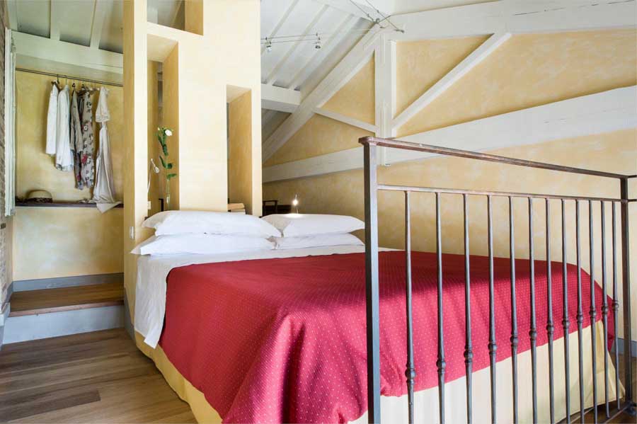 Eine beeindruckende Glastreppe führt in das offene Mansardenzimmer (Doppelbett).