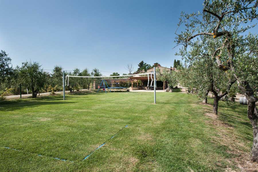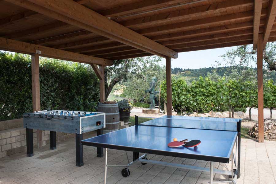Zur Freude von Groß und Klein gehören auch folgende sportliche Aktivitäten/Angebote zum Anwesen: Tischtennis, Volleyballfeld, Fitness-Bereich, Mountain-Bike-Vermietung, Fußballfeld. Ein durchweg heimeliges Ambiente, zum Wohlfühlen! Umgeben von 30 Hektar mit Weinbergen, Olivenhainen und Wald, werden hier feine Rotweine und ein sehr gutes Olivenöl erzeugt. Eine Weinverkostung ist ein "must" und ein Willkommens-Präsent erwartet den Gast bei der Anreise!