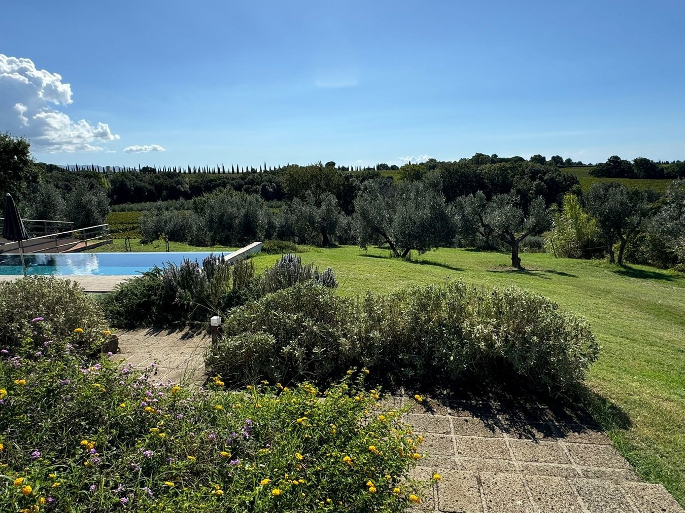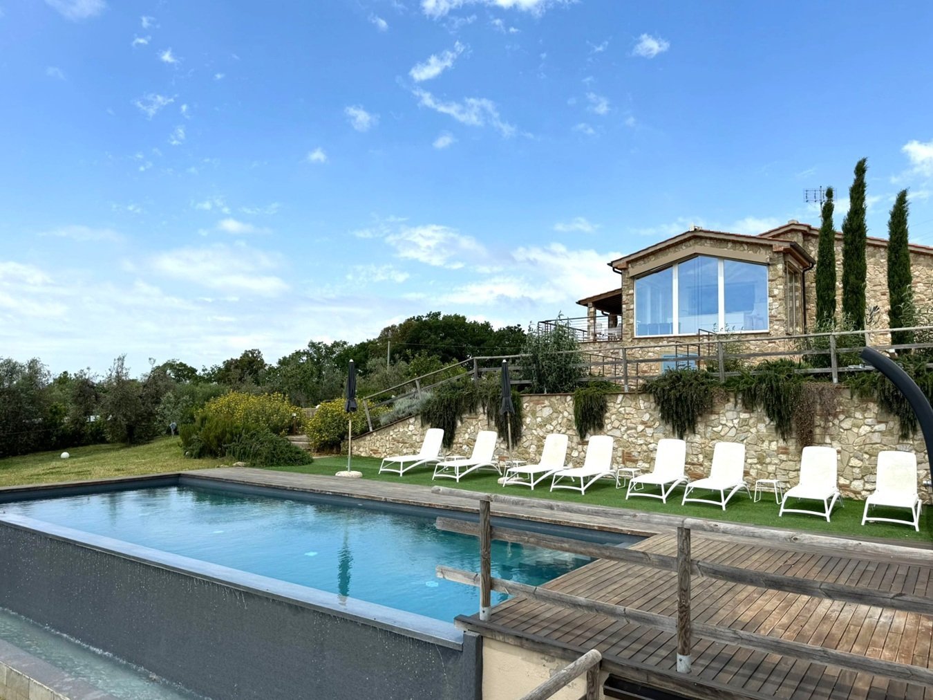 Die vier Schlafzimmer mit ensuite-Badezimmern sind auf zwei Etagen verteilt und verfügen über 2 separate Wohnzimmer; die Villa ist somit auch für befreundete Familien ideal und die Zimmer sind mit geschmackvollen Akzenten dekoriert. Die Farbgebung in einer harmonischen Kombination von Erdtönen und hellen Farben trägt zu der einzigartigen Atmosphäre dieser stilvollen Landvilla bei. Besondere Beachtung verdienen nicht nur der wunderschön gelegene Infinity-Pool (12 x 4 M.) –eine Einladung zum Träumen und Relaxen--, sondern auch die sehr gut ausgestattete Küche mit angeschlossener überdachter Terrasse, wo jede noch so kleine Mahlzeit zum Erlebnis wird! Es ist das perfekte Urlaubsdomizil für alle, die sich nach Sport, Kultur und Weingastronomie der Extraklasse sehnen.