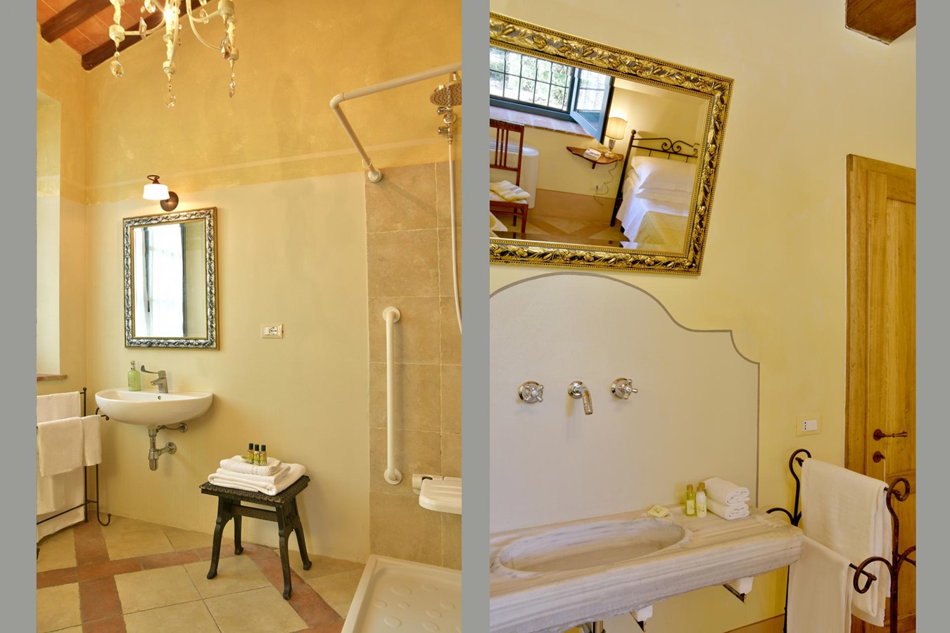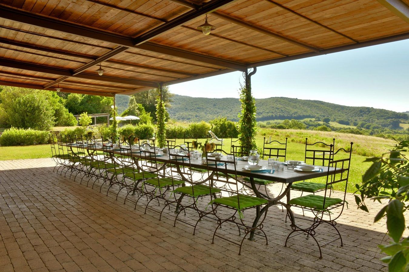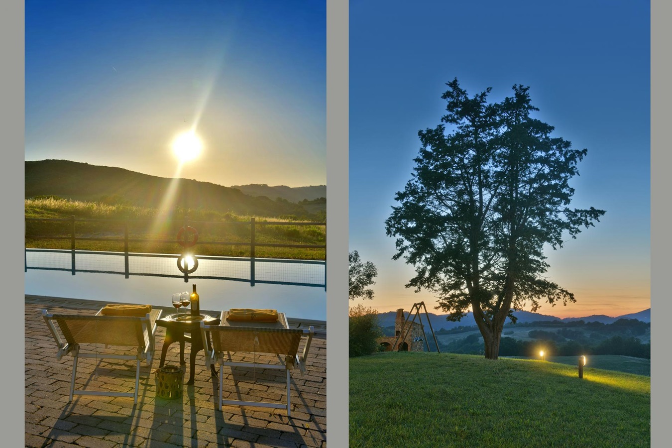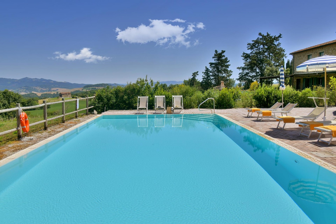Man genießt einen großartigen Panoramablick über die umliegende Hügellandschaft und eine absolute Privatsphäre ist garantiert. Die Einrichtung und Ausstattung, stilsicher mit geschmackvollem Landhausmobiliar, Liebe zum Detail und die Kombination von antiken Holzbalkendecken, Cottoböden, Marmor-Waschbecken, in Verbindung mit modernen Küchen und Badezimmern, ist besonders gut gelungen.