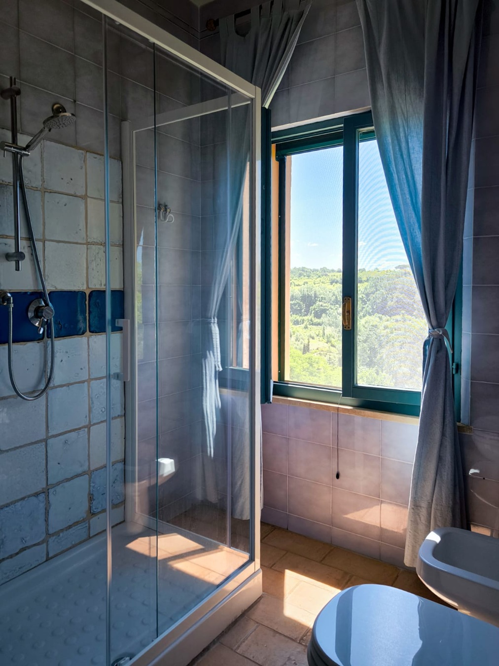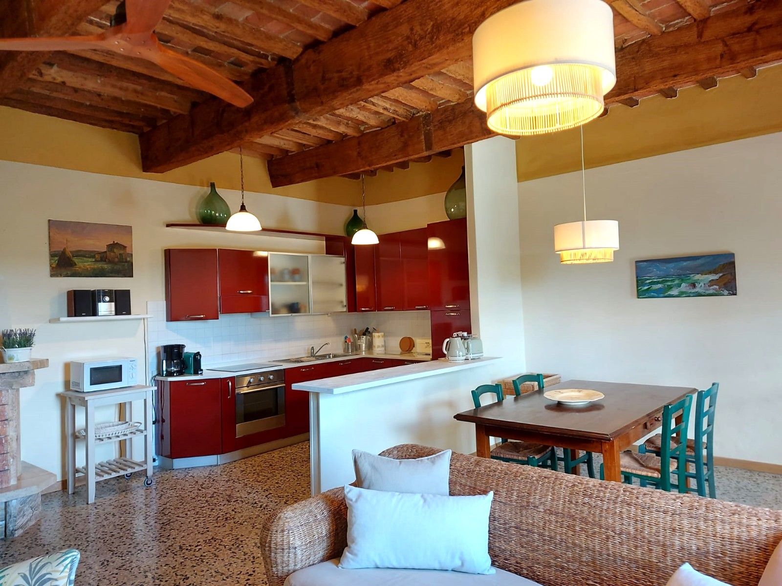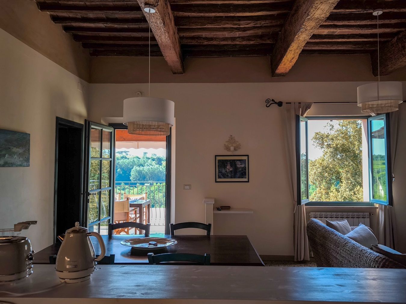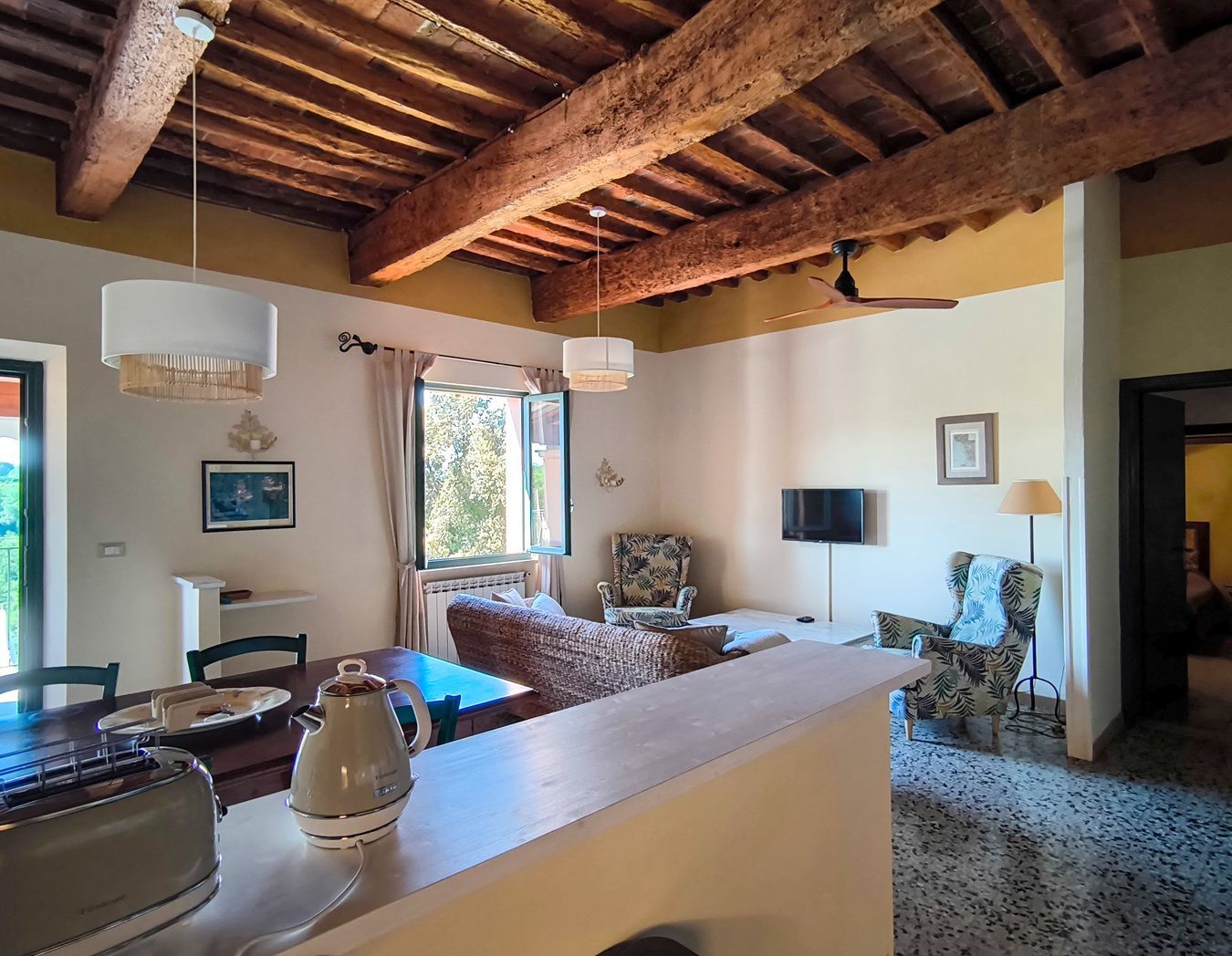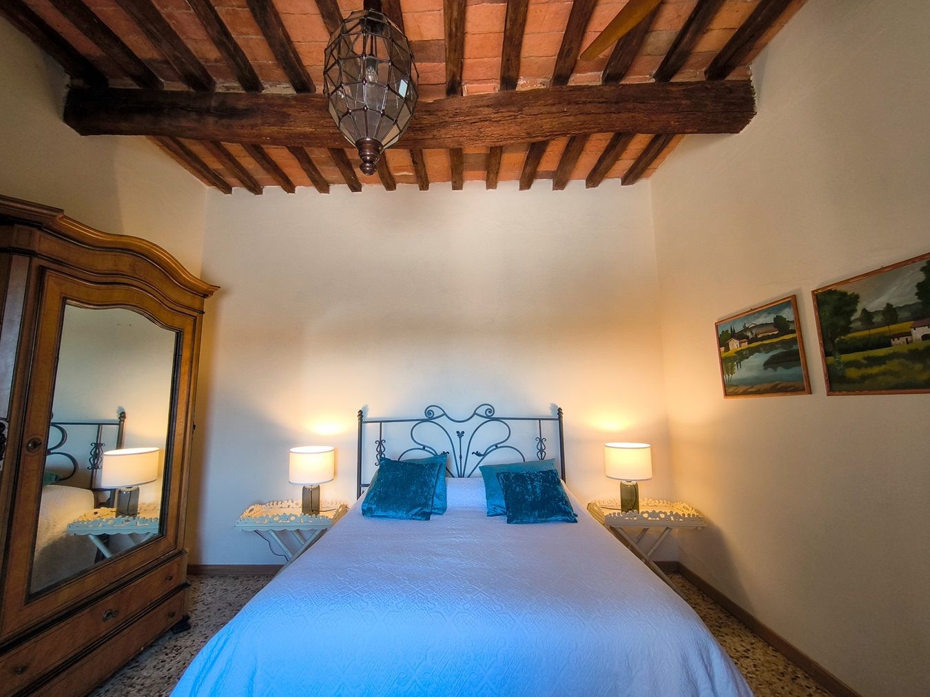 Die historisch geprägte Struktur, wie Holzbalkendecken und Rundbögen, blieb erhalten und verleiht dem Anwesen seine typisch toskanische Ausstrahlung. Die Räume vermitteln Gemütlichkeit und Wohnqualität; sie sind geschmackvoll und individuell eingerichtet. Wir befinden uns am Rande von San Gervasio, so dass wir isoliert, abseits von der Strasse und mitten in den Hügeln liegen. Das terrassenförmige Hanggrundstück erstreckt sich über 3 ha. Land wo es überwiegend Olivenbäume gibt. Der Herr des Hauses, Sig. Daniele, kommt aus der Gastronomie und bietet den Gästen, nach Absprache ein köstliches toskanisches Abendessen an.