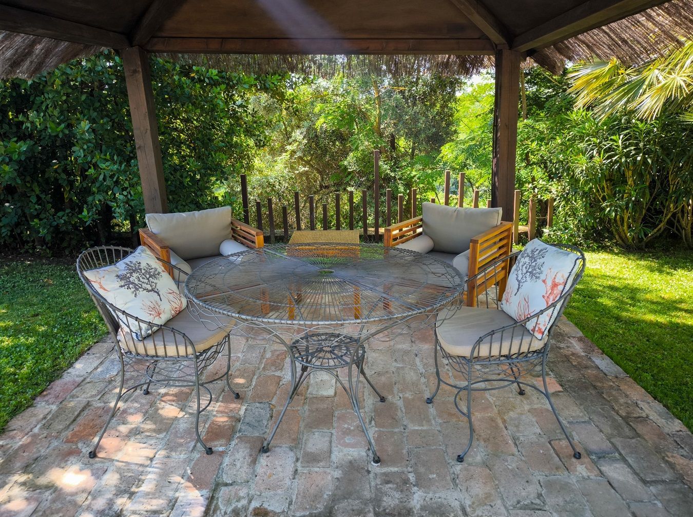 Privatgarten, Tisch u. Stühle plus ein überdachter privater Freisitz mit Outdoor-Sesseln, Tisch u. Stühle.