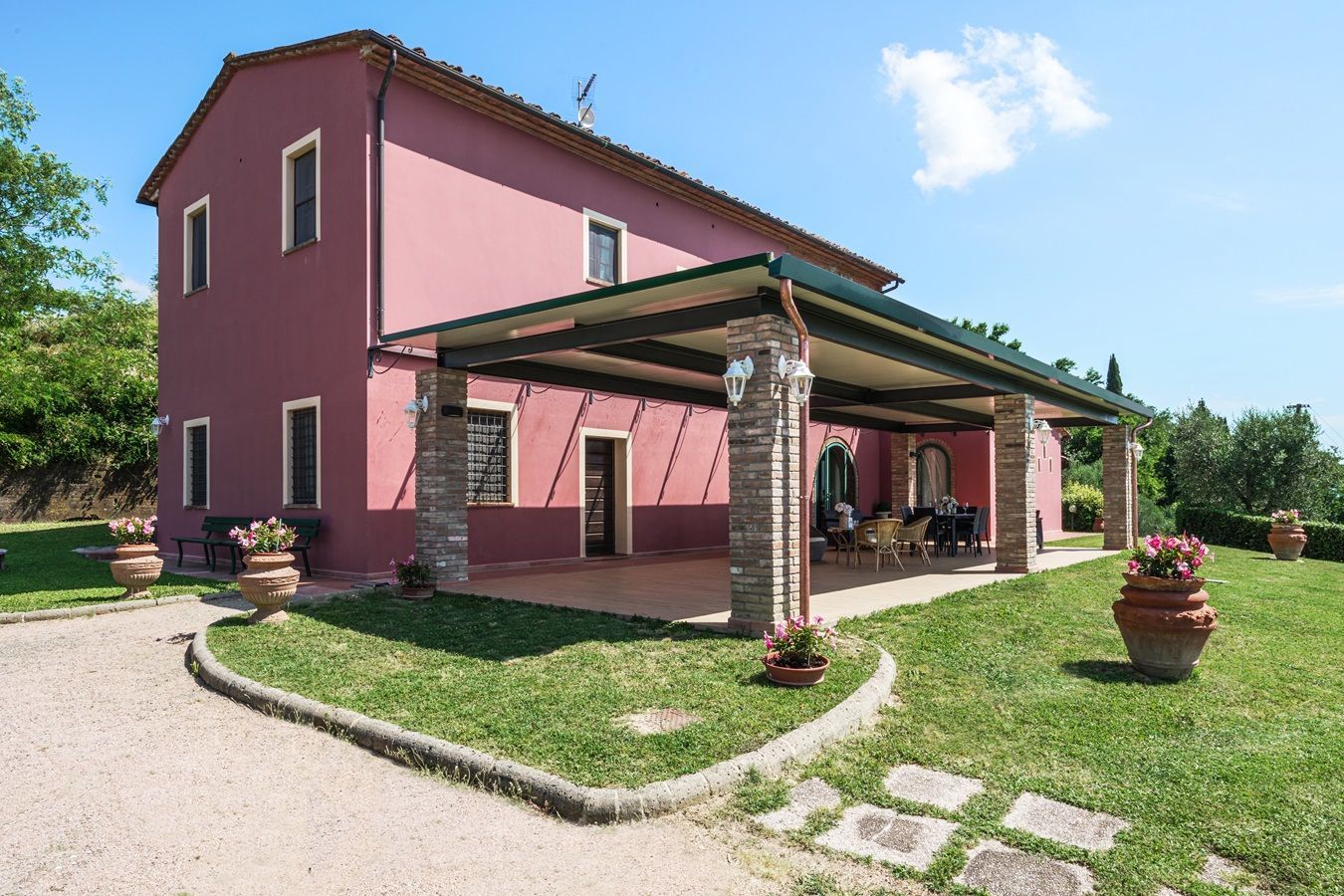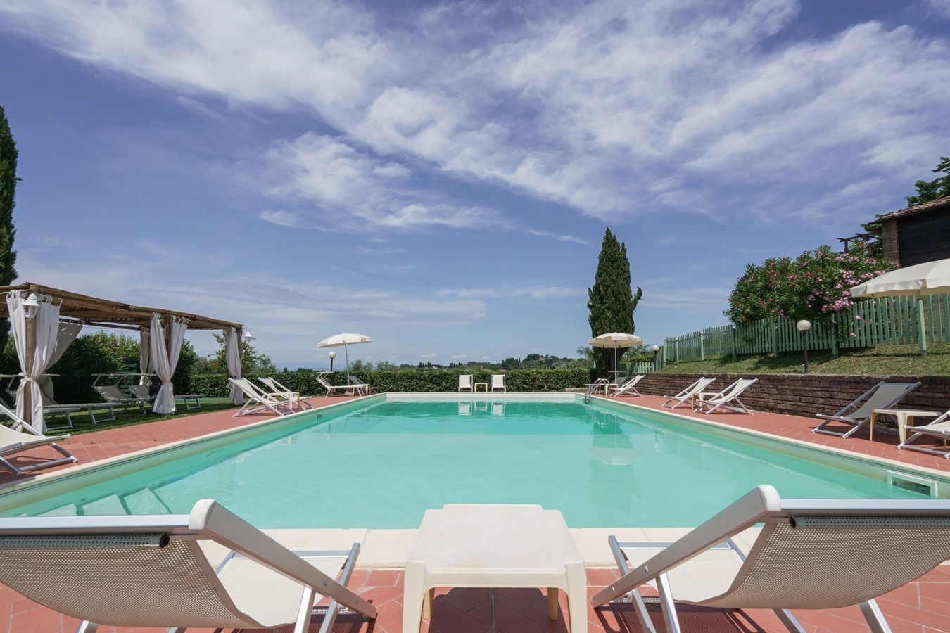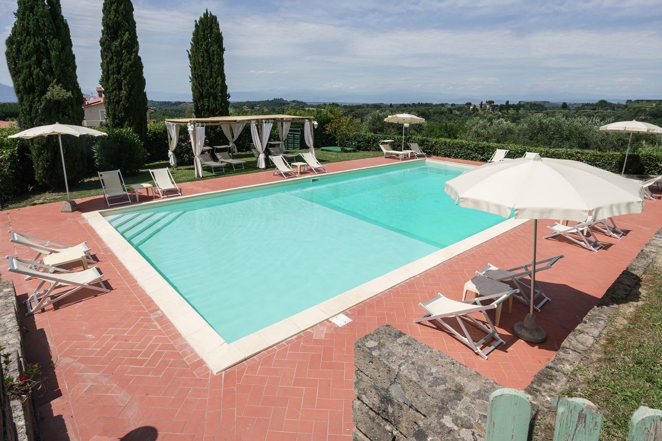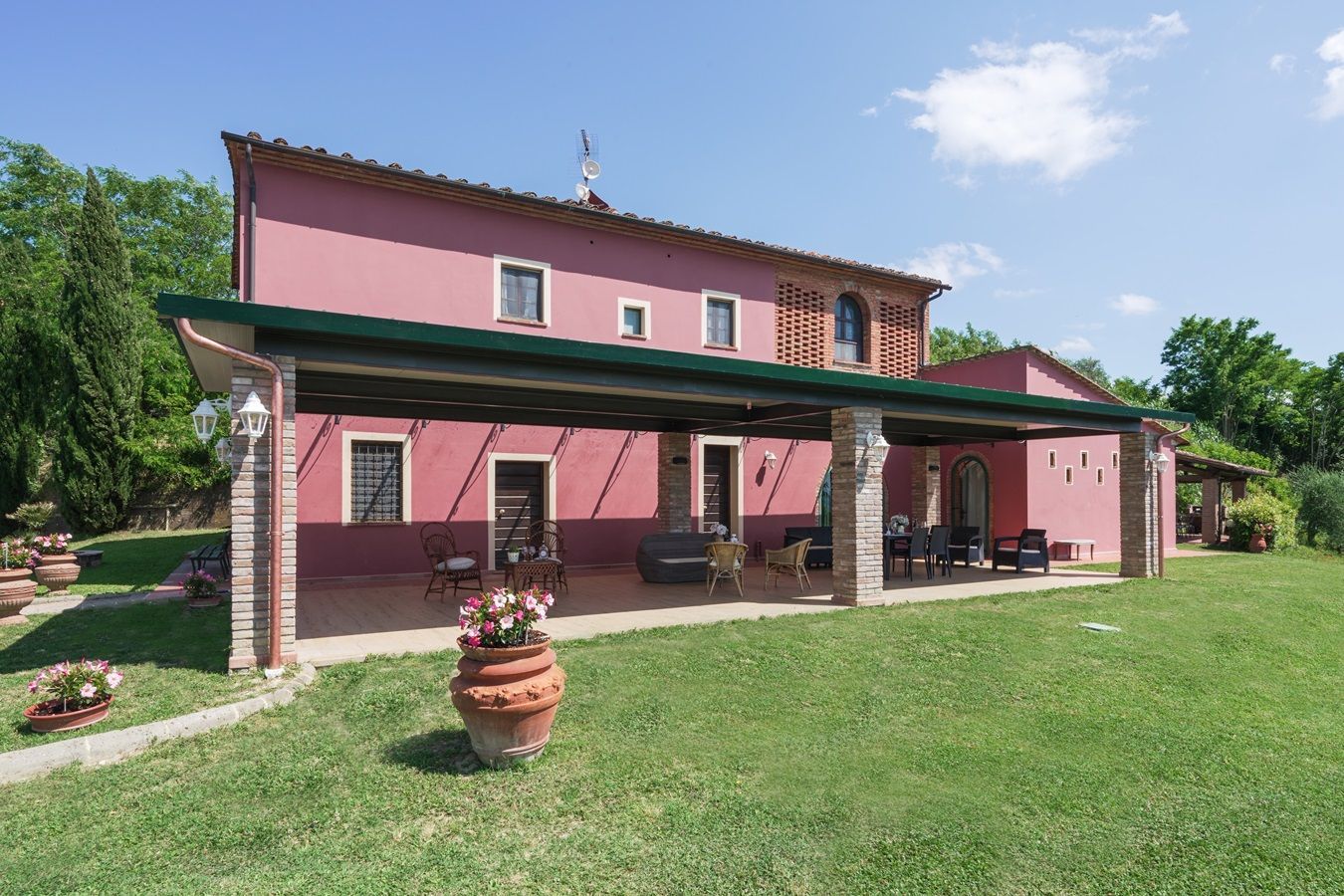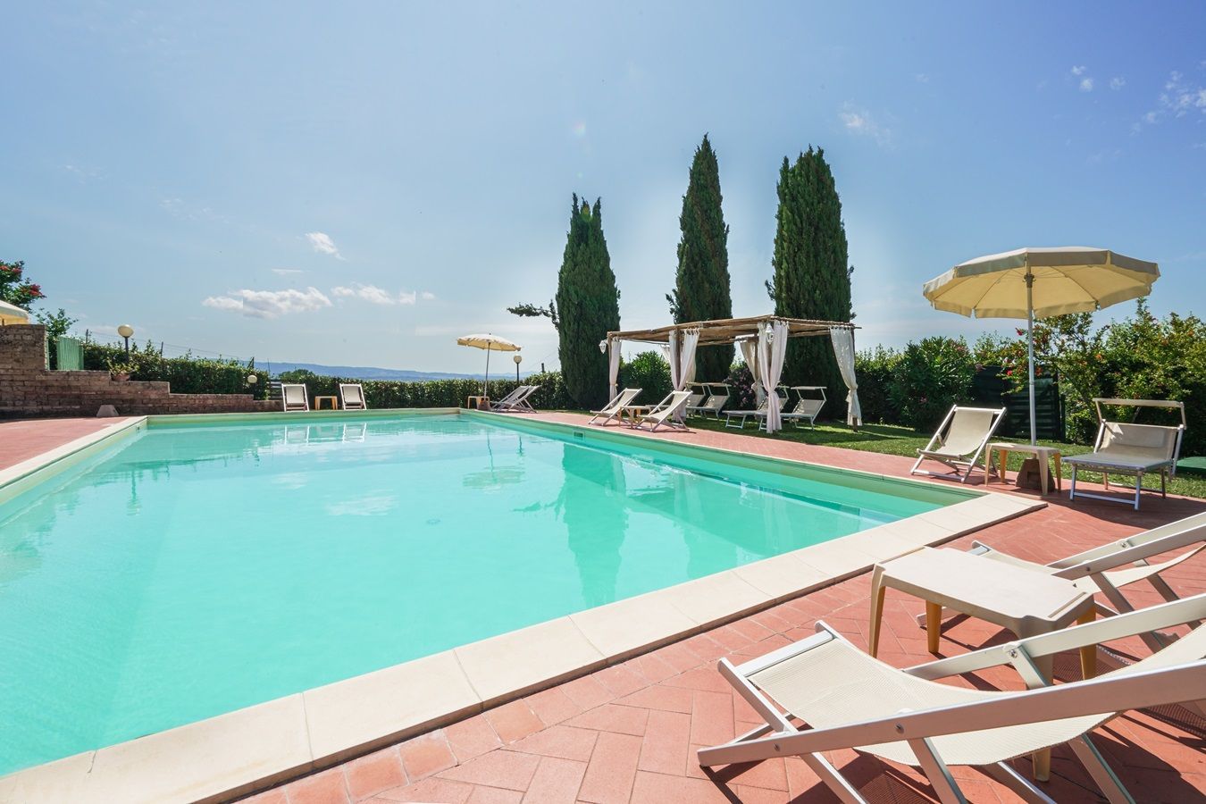 Auf einem kleinen Hügel thronend liegt Villa Sole, ein großzügiges toskanisches Landhaus, ruhig und in schöner Lage mit beeindruckendem Panorama. Zudem ist dieses herrlich angelegte Domizil, mit 5 Schlafzimmern und 5 angeschlossenen Badezimmern, plus großzügiger überdachter Aussenterrasse ausgestattet und somit für große Familien- und Freundesgruppen besonders attraktiv! Das Haus ist im einladenden toskanischem Stil eingerichtet, die Küche und Badezimmer bieten einen guten Komfort, zum Wohlfühlen!