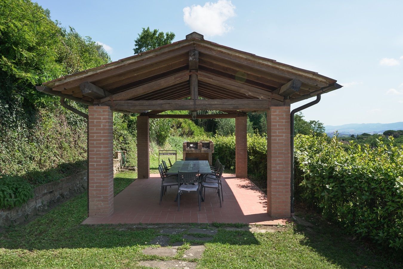 Der zum Landhaus gehörende (eingezäunte) Privatpool --13 x 7 Meter-- in Panoramalage bietet Ruhe und Entspannung, um den Blick auf die herrliche Landschaft genießen zu können. Zudem verfügt das Anwesen über einen gemütlichen überdachten Freisitz mit Barbecue, einer Tischtennisplatte und einem großen Kamin im Wohnesszimmer, d.h. ideale Voraussetzungen für unvergessliche, erholsame Ferientage! Der schöne Garten wird in besonderer Weise von Familien mit Kindern geschätzt, und zu Fuß erreicht man (ca. 500 Meter) ein ganz reizvolles Dorf, wo es kleine Geschäfte, Restaurants und Cafés gibt.